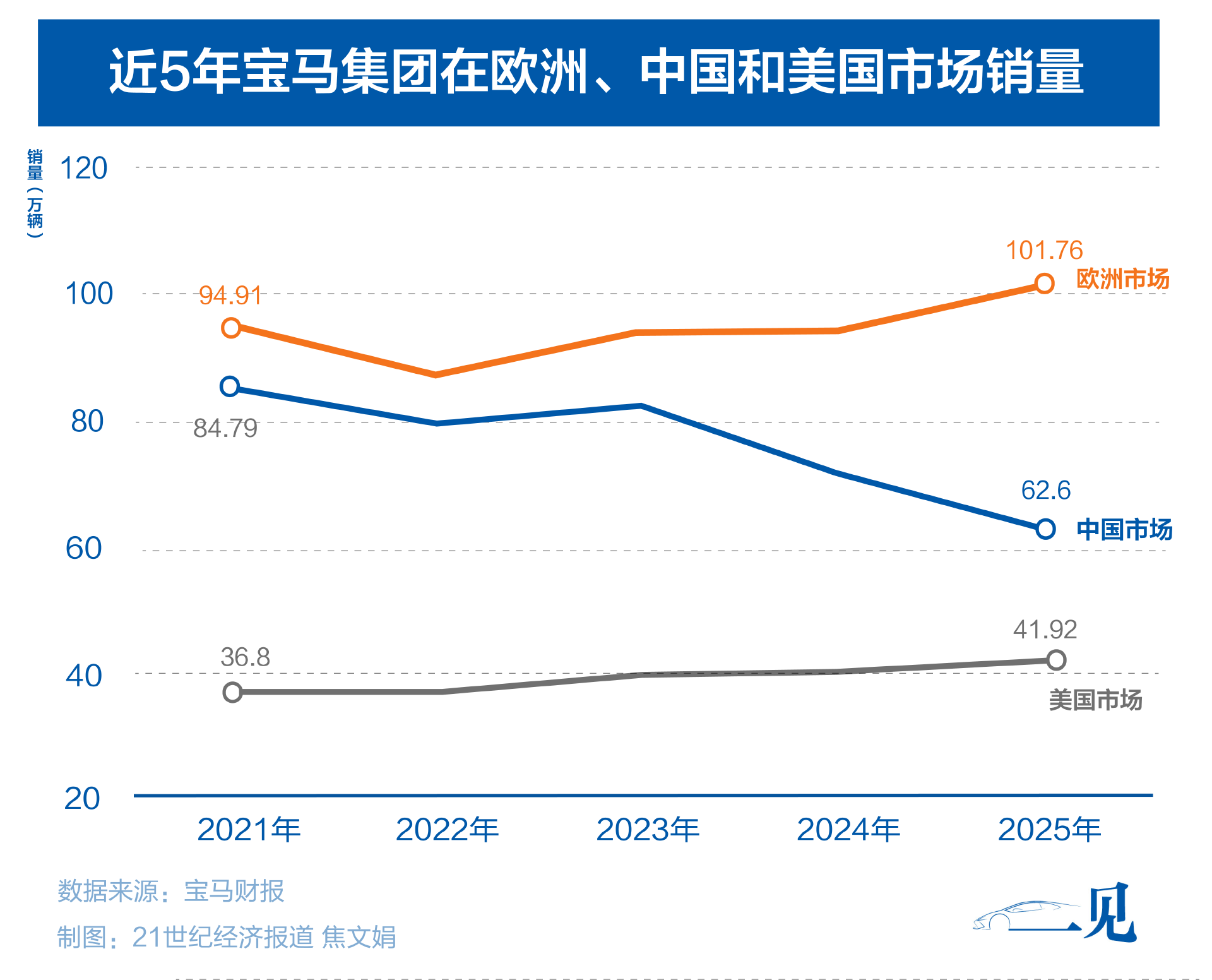 财报显示,2025年,宝马在欧洲市场卖出101.8万辆新车,同比增长7.3%;美国市场销量约41.9万辆,增长5%。而在其最大的单一市场中国,销量同比下滑12.5%,降至62.6万辆。