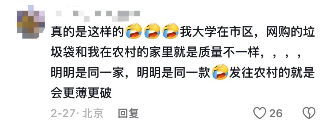 “商家的心理很简单,大城市人维权意识强,而且快递业发达,用次品去糊弄很容易被发现;而小县城的人对品质要求不高,尤其在交通不方便的村镇,连拿个快递都要跑好几公里,退货太麻烦了,很多人即使觉得质量不好,大概率也就凑合留着用。”