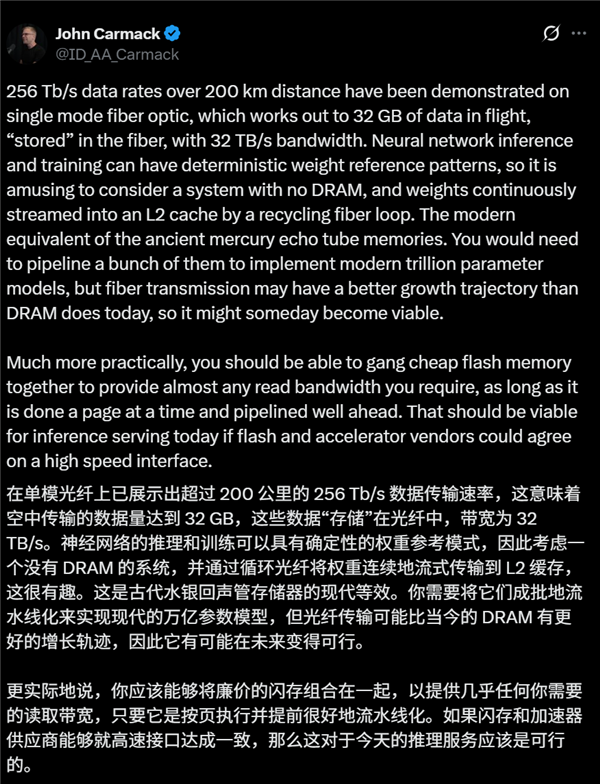 总的来说,卡神、马斯克提出的这种设想很有趣,等于用光纤的超高速传输特性来取代如今一样昂贵的内存,该技术也不是没有缺点,但可以通过改进AI训练来减少甚至避免。